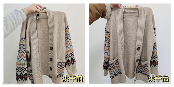 毛衣烘完有股很好闻的阳光的味道 白色那件是我昂贵的小羊绒衫,烘完也明显感觉到毛衣没有像放进我家那台烘干机一样绒毛变形,整个更加蓬松、舒展了,穿起来也很舒服 在烘干性能测试方面,这一款干衣机对于不同材质的衣物的烘干表现都是比较不错的,特别是对于衬衫、毛衣等衣物的烘干上,能够有效的进行快速烘干,非常推荐入手。