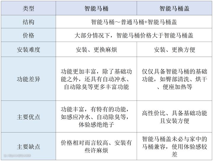 一般市场上关于智能马桶的选择,你会看到两种产品,一是智能马桶一体机(外观就是一个马桶),二是智能马桶盖(外观是一个马桶盖子)。对智能马桶比较陌生的朋友,想必是不会知道这两者又有什么区别,应该选择哪一类的使用体验感会更好,因此,下面用一张表格罗列说明:
