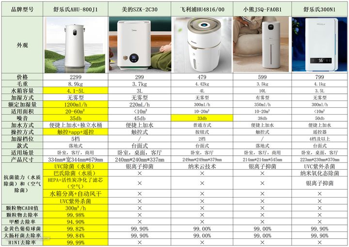 为什么加湿器久盛不衰,市场用户量持续增长?因为加湿器真的是四季皆宜。冬天天气干燥,尤其是烧暖气、烧地暖,天气太干燥,身体的水分就会流失,抹再多的护肤品都还是干的发痒、掉皮。夏天,开空调,温度下来了,把空气中的水分也抽走了,长期呆在空调房,皮肤也照旧干燥。春秋换季,更是过敏性性疾病的高发期。 备上一台加湿器,持续保持空气湿度,对皮肤、对心情、对身体健康都是非常有益的。 这些品牌都是各平台的热销款,而且照顾到了各个价格段朋友们的需求,做参数对比如下: