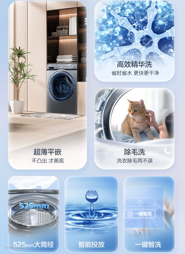 此外,本品特色的洗衣模式还有夜洗、除毛洗、特渍洗等等,加上除菌除螨率高达99%的深层水洗功能,方便实用