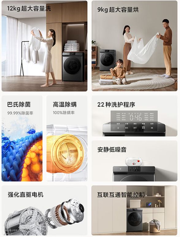 米家这款XHQG120MJ202是一个热销爆款,主要是性价比爆棚,首先其超大容量12公斤就是一大卖点,全家衣物,包括床单被罩,一次洗净,清洗效率更高,并且其是一款洗烘一体机,与一般洗烘一体机,烘干容量是洗涤容量的一半不同,米家这款洗衣机的烘干容量多达9公斤,这就比较厉害了,洗衣,烘干效率都高,一次搞定,还是相当吸引人的
