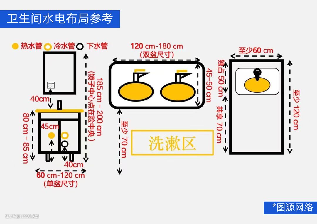 ①洗手盆离地40cm左右,需预留冷热水、下水管;