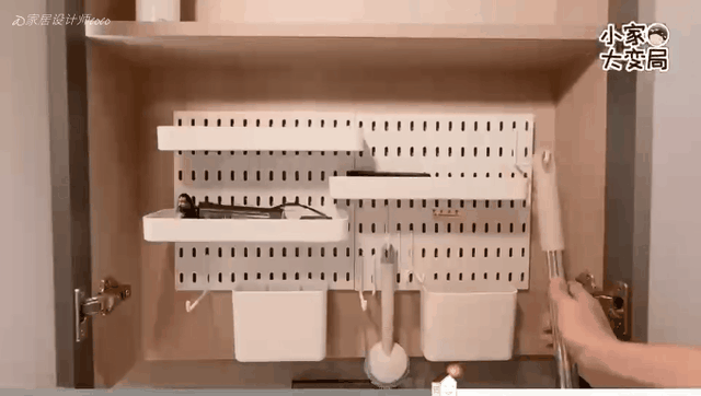 同样的道理,如果你家里的镜柜足够大,也可以利用“无底柜”搭配洞洞板的方式来收纳清洁工具,像刮水板、拖把、肥皂、抹布等等。