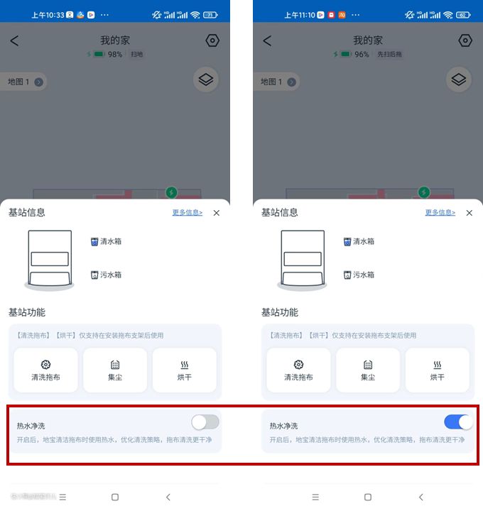 APP开启热水洗拖布按钮,就默认联动开启了热水拖地。基站在往机器人内嵌水箱加水时就默认加注热水。