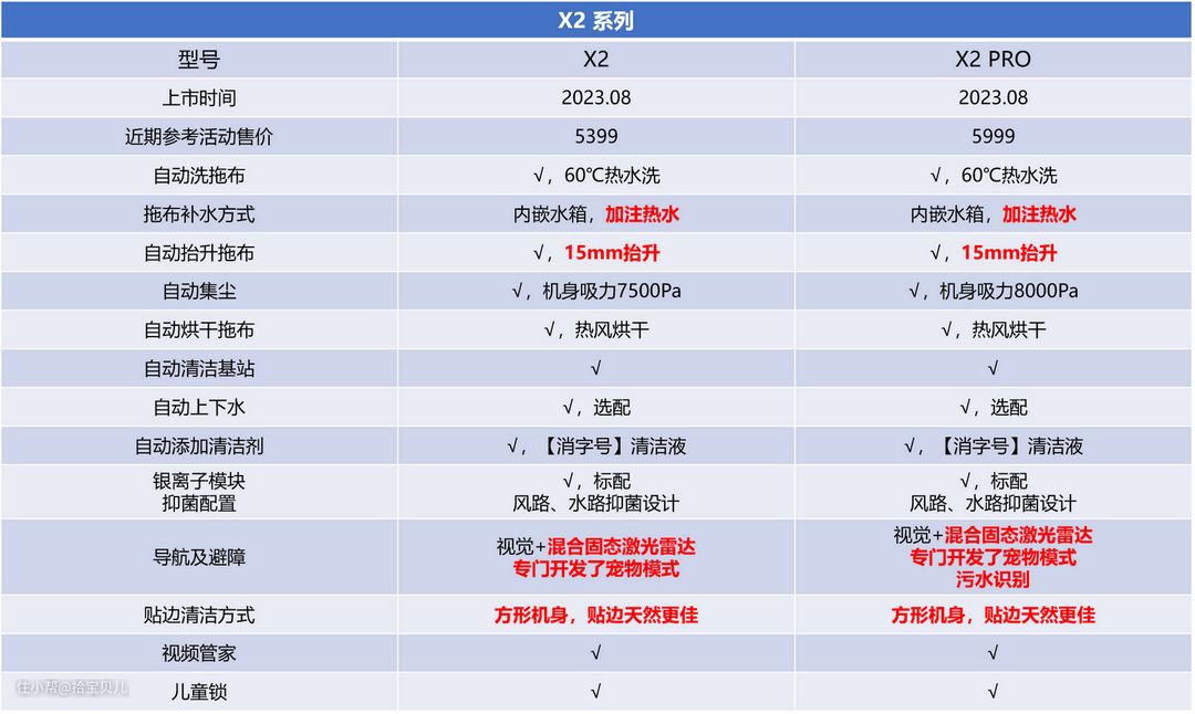 我是工程技术人员,单从技术角度来说,科沃斯X2的创新点,引领行业进步的技术点,会更多一写,比如独家首创搭载了固态激光雷达,开发了针对宠物家庭的宠物模式等,毕竟是龙头品牌,行业的创新点几乎都出自科沃斯。