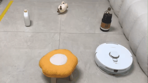 避障方面可以看到,也是难免会偶尔触碰,甚至推动小物件走一点点。但是好在也很克制,碰到了会转回头。