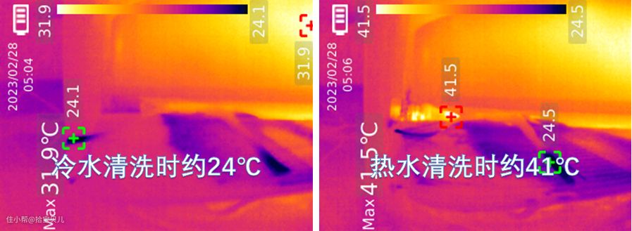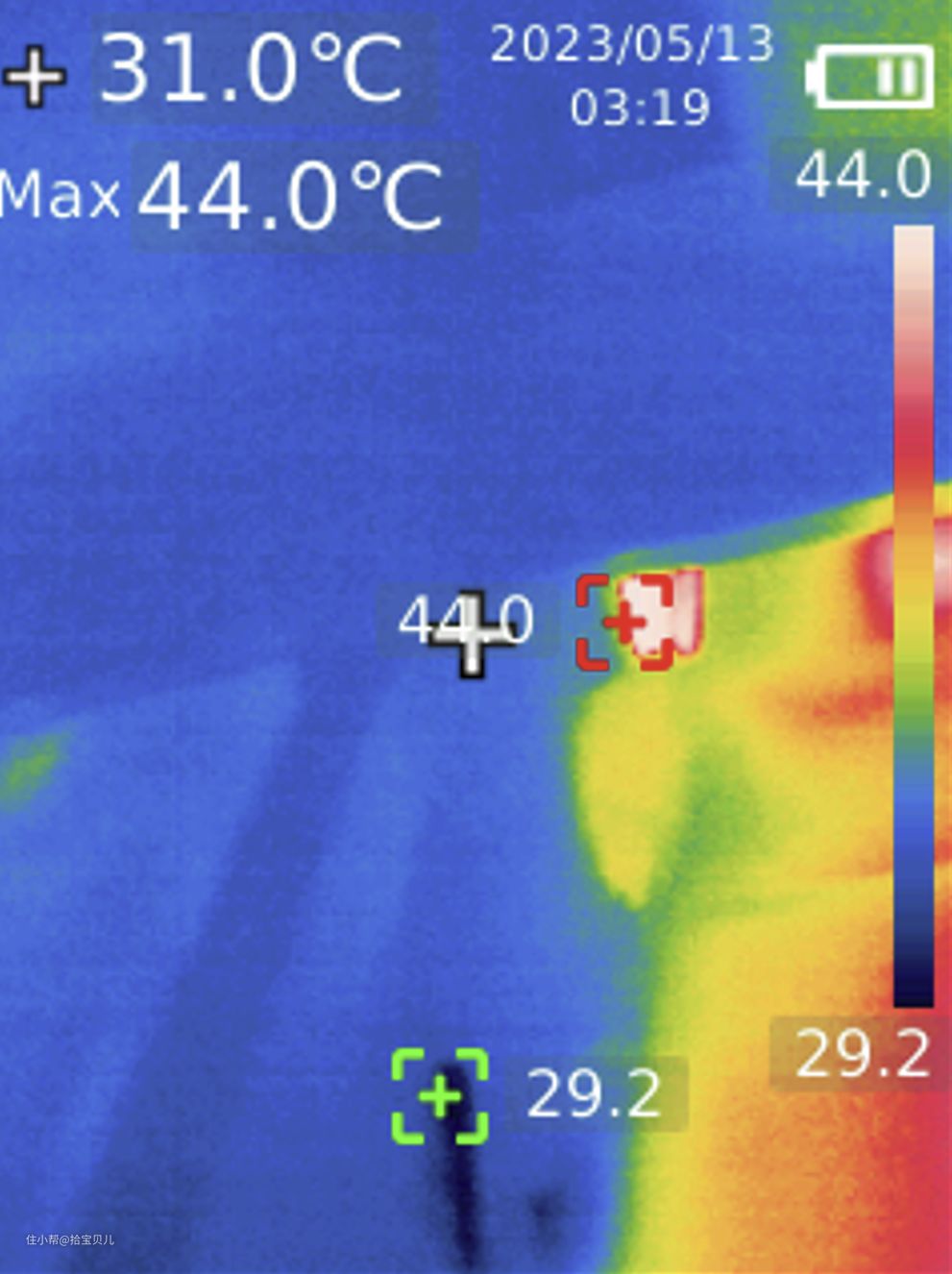 基站热水洗拖布时用成像仪拍了一下,可以看到基站拖布水洗处最高拍到了44℃,这就说明加热模块出水的温度会更高。