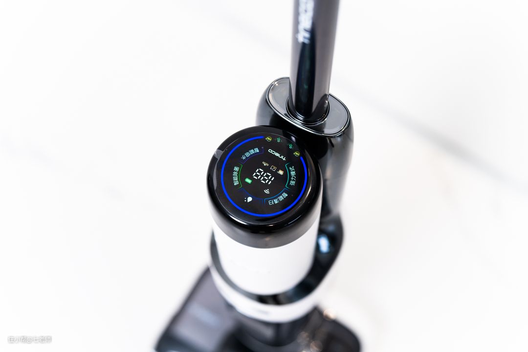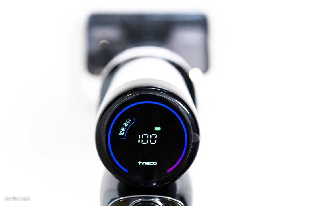 LED 屏幕依旧位于机身上方,通过最外圈是红蓝环和中间的图文标志实时呈现洗地机的清洁模式和电量情况,屏幕部分采用收窄的设计,视觉上更加纤细。