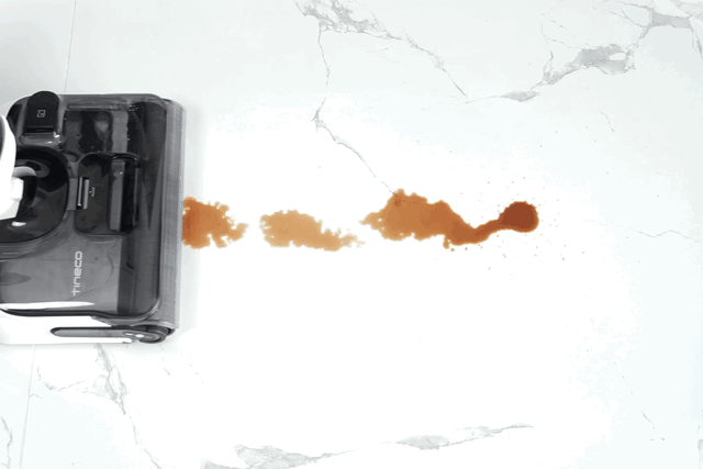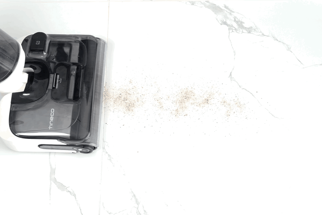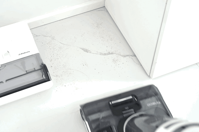 活水刷洗,添可精灵可躺平洗地机对地面上细小干垃圾的清洁效果比手持吸尘器更彻底,藏在瓷砖拼接缝隙处的咖啡粉也能彻底清洁干净。