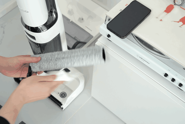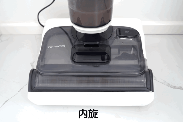 取下充当盖板的净水箱后,可以看到添可精灵可躺平洗地机的刷头采用无边框设计,这样的刷头设计具有不易堆积垃圾、清理简单的优势。