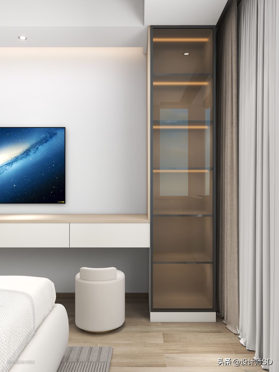 “顶面”在衣帽间的空间做了平顶的布置,而在卧室这一次,做了无主灯的效果,一圈边吊顶跟梁底齐平,没有做很宽,尽量的让中间平顶的比例显大,在顶面电视机跟床头背景墙上方预留了灯槽,见光不见灯的氛围感让房间看上去很是温馨。