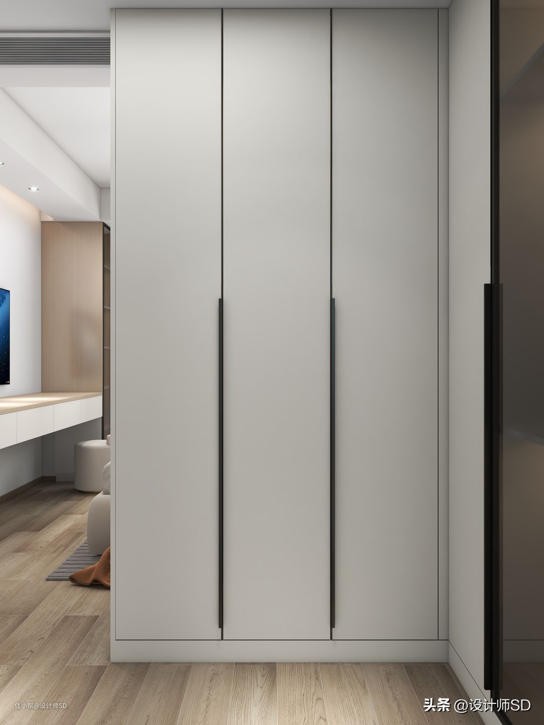“衣帽间”在房门的对面,布置了L型的柜体,右侧两门搭配了一扇玻璃门板,让视觉看上去有通透感一些,左侧的柜体则是三门的结构,白色的柜体板搭配平板门,安装黑色的封边拉手,一门到顶的样式让整个柜体看上去大方又实用。