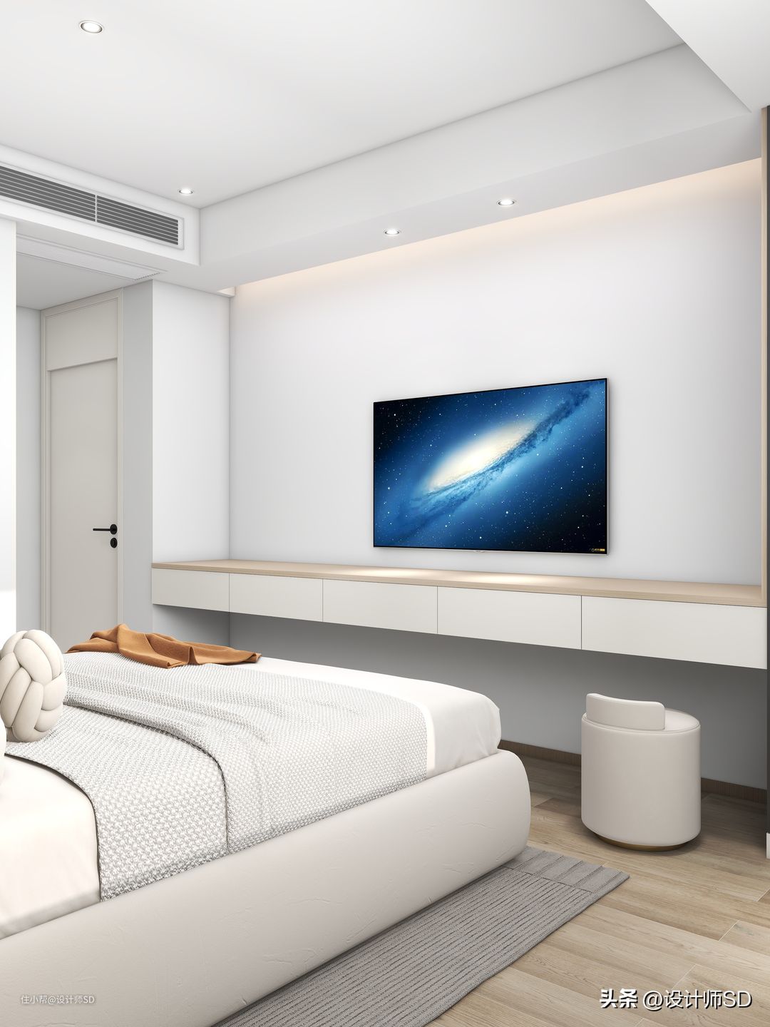 空调选择的是顶面安装的风管机,节省空间又美观,同时布置了床头背景墙,看上去也是更加的整体耐看。