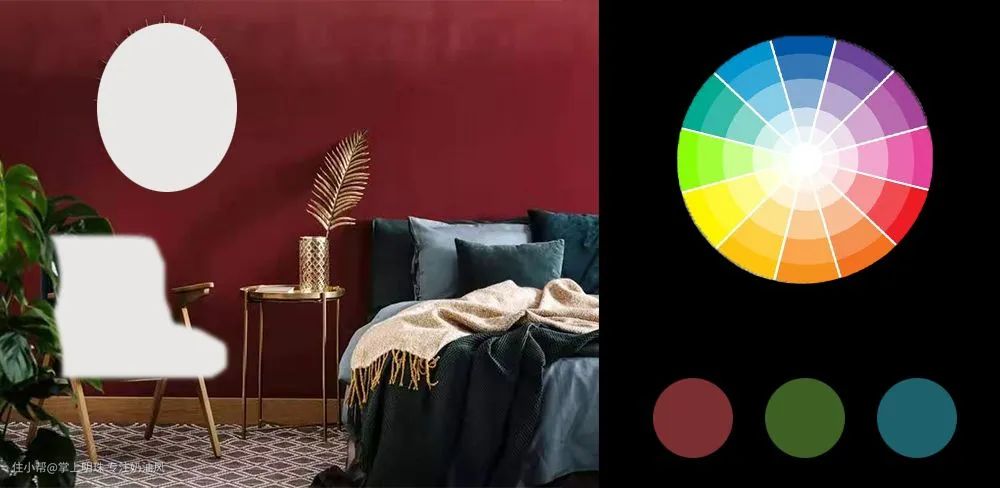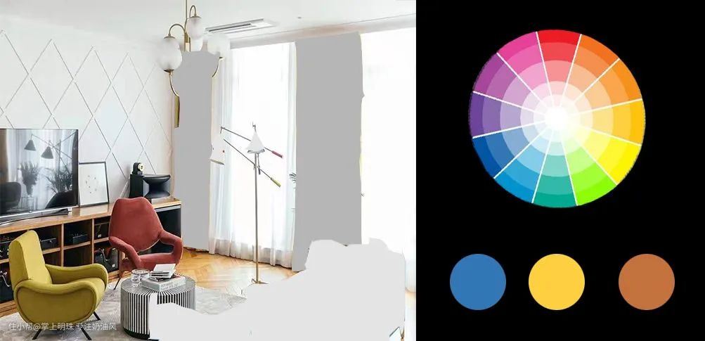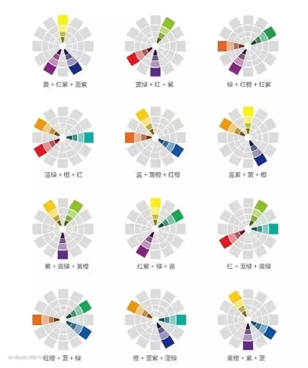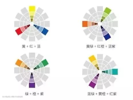 三等分互补色,是在色轮里形成等边三角形关系的颜色组合在一起。