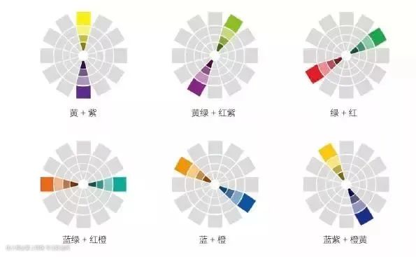 分裂互补色,是指色轮里任意一个颜色与直接互补色旁边的两个颜色所组成的配色方案,分类互补色具有一种“曲线救国”的意味。