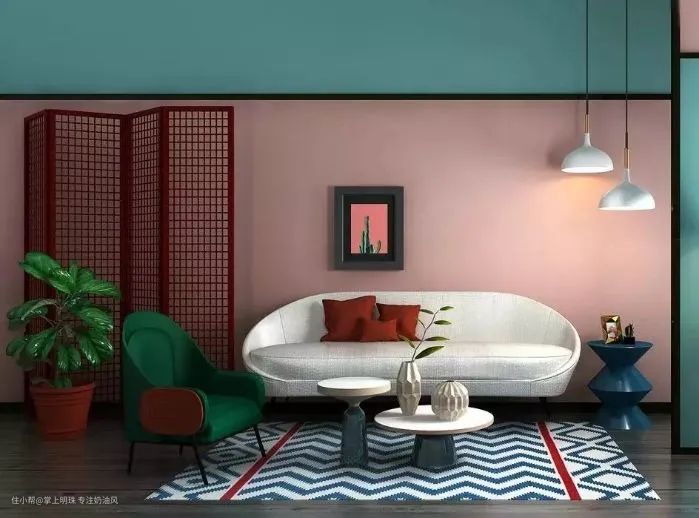撞色或者互补色都可以。青色的互补色为红色,在我看来,再恰当不过了,一冷一暖,完美调和,沙发成了诺大空间里的焦点,吸睛而又温和。采用莫兰迪色系,经典而高级。