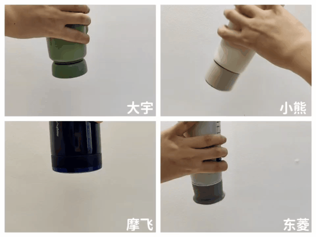 4款水杯的重量都在0.4kg左右,总的来说,摩飞会偏重一点点,其他三款都很便携轻巧,小熊和大宇最轻。