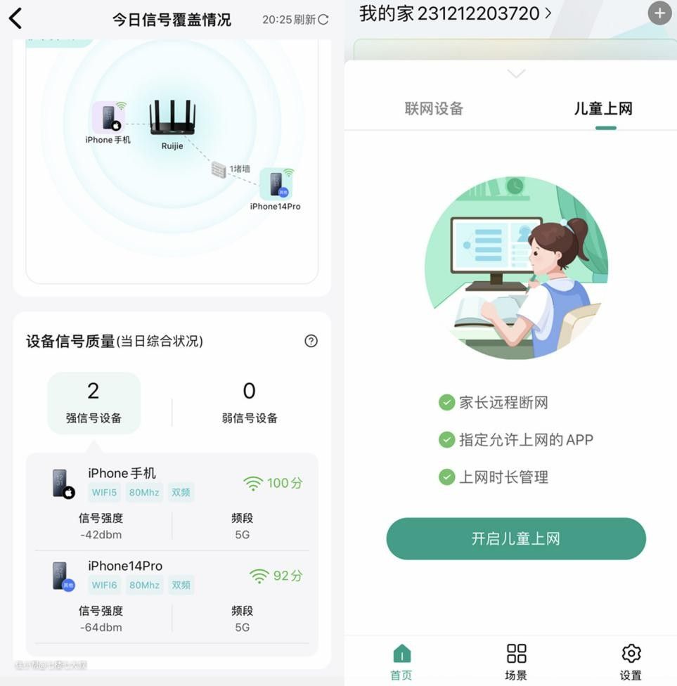 锐捷捷豹路由器有专门的APP负责控制,在页面里可以看到连接到网络的设备以及和设备之间的信号强度等参数。