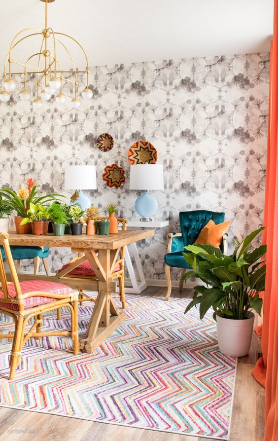 要打造真正的波西米亚风格外观,不要害怕混搭图案。波西米亚设计的特点是轻松、不拘一格,所以尽情发挥您的创造力吧。将色彩缤纷的锯齿形地毯与图案印花壁纸相结合,营造出俏皮而充满活力的氛围。关键是要让人觉得你没有再考虑过。让图案自然流动,营造出诱人而轻松的氛围。