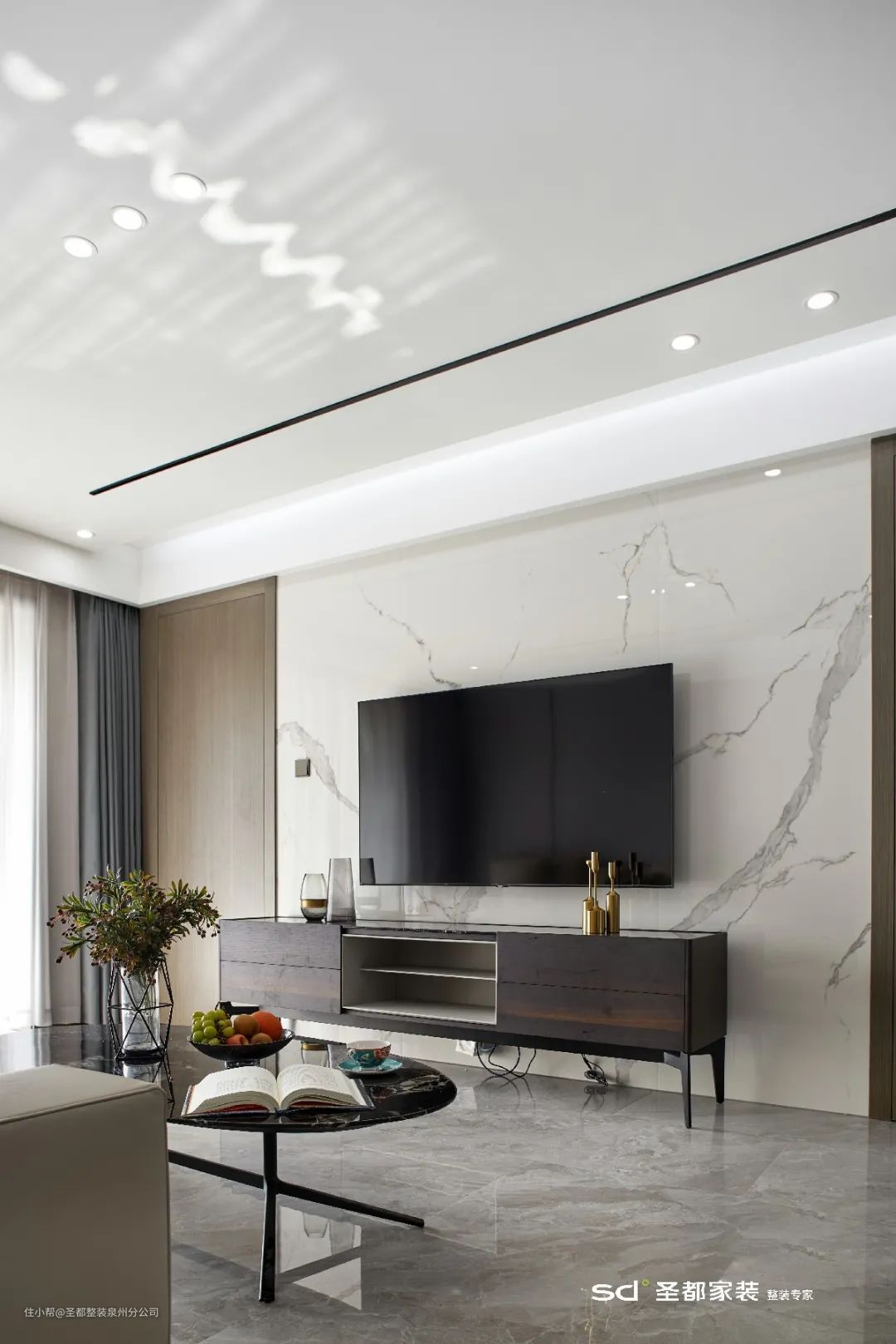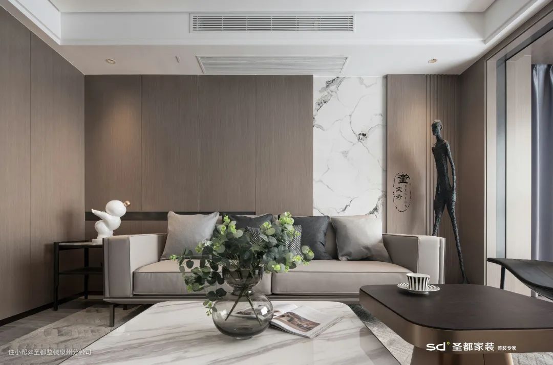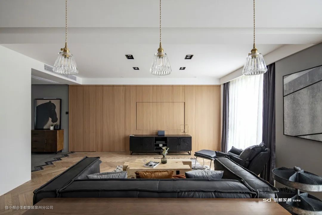 一般来说,客厅的背景墙都比较大,徒留一面大白墙难免单调乏味,不如适当融入木饰面加以装饰,让木作雅调占据视觉焦点,形成大气简约又不失温馨质感的社交场所。