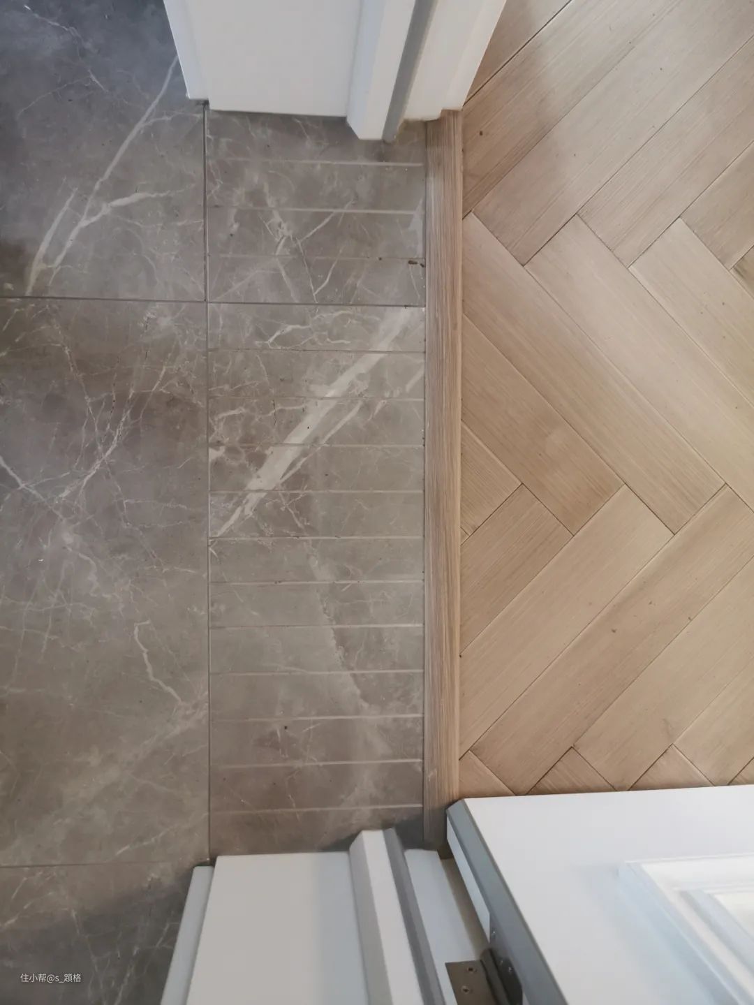 当地面材质不同时,通常会使用门槛石来过渡。然而,那条黑乎乎的门槛石真的很难看。