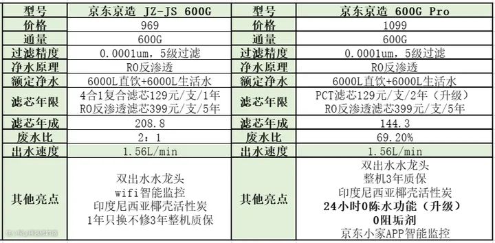 - 京造600G|600Gpro:不到1000元,滤芯年成本也就200出头,让每个家庭都喝上便宜干净的水。升级版加了零陈水功能,滤芯成本再降