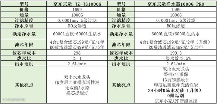 京造1000G|1000Gpro:性价比之选,滤芯成本也是200-300,出水流量大,关键活动价格最低做到了1599,升级版加了零陈水功能,滤芯成本再降