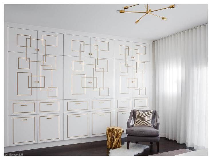 一个现代的金色橱柜,顶部装有玻璃和金色的灯,坐落在灰色护墙板前面的黑色地毯上,旁边是一张铺有铂灰色床上用品的浅灰色翼背床。