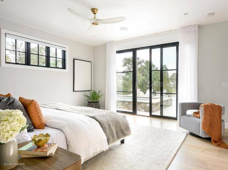 宽敞的卧室配有一张黑色平台床,奶油色地毯上配有橙色和灰色天鹅绒枕头、灰色椅子、黑色框窗户和白色和金色现代吊扇。