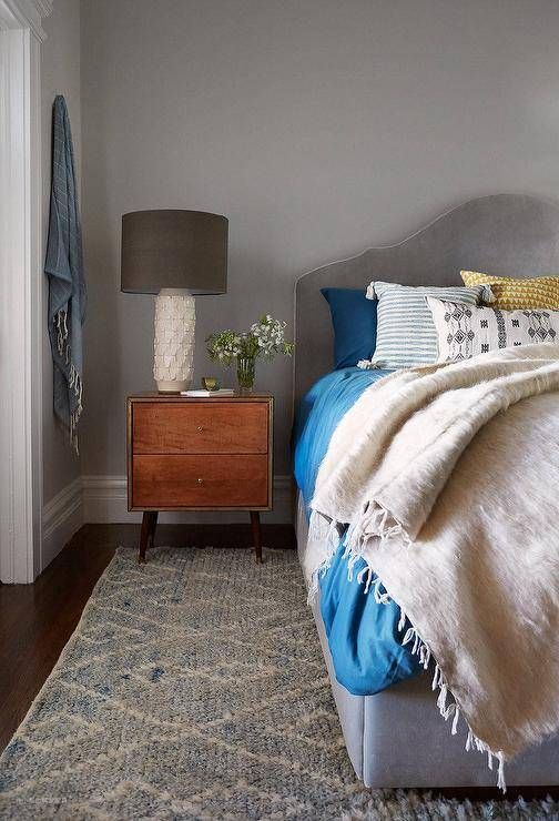 一张灰色天鹅绒软垫床,上面铺着大胆的蓝色床上用品,旁边是一个中世纪现代木质床头柜,旁边是一盏象牙灯,旁边是蓝色羊毛地毯。