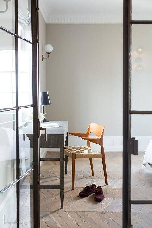 这座华丽的中世纪现代工作空间拥有钢制和玻璃门,打开后可看到一把木头和编织的椅子,椅子放置在黑色甲板上的人字形地板上,顶部有一盏黑色灯。