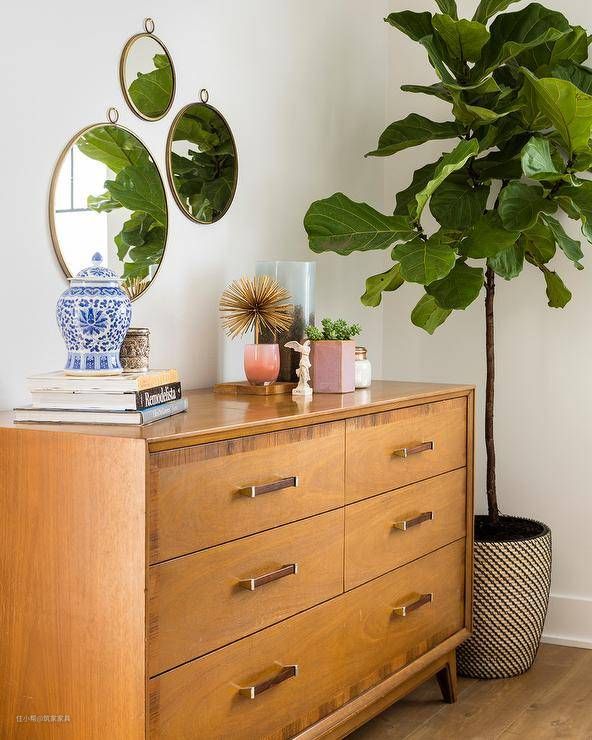 一面圆形银色镜子悬挂在棕色复古梳妆台上,梳妆台上有白色尿布垫。梳妆台位于悬挂的绿色抽象艺术作品和琴叶无花果植物之间。