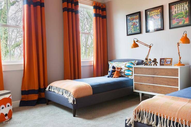 蓝色和橙色共用的男孩卧室配有带框的漫画书封面,上面放置着一对蓝色亚麻软垫单人床,床上用品为蓝色床上用品和橙色人字形毯子,侧面是共用的中世纪现代风格梳妆台作为床头柜,顶部装有橙色工作灯,窗户旁边装有带有蓝色条纹的亮橙色窗帘。