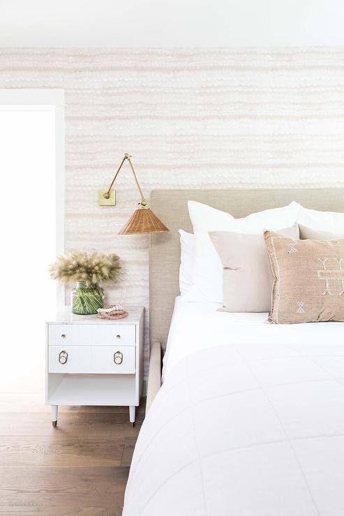 全墙白色软垫床头板装饰着一张特大号床,并配有黑色摇臂壁灯照明的白色床上用品和灰褐色格子腰枕。床边的白色和棕色床头柜上摆放着一件抽象艺术作品。