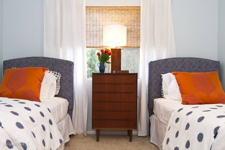 蓝色和橙色的男孩卧室配有两张单人床,两侧是中世纪现代床头柜,配有现代木制台灯。床头柜位于明亮的窗户前,窗户上挂着编织百叶窗和白色棉质窗帘。牛仔蓝色的床头板搭配清爽的白色床单、焦橙色枕头和带有蓝色圆点的白色羽绒被。