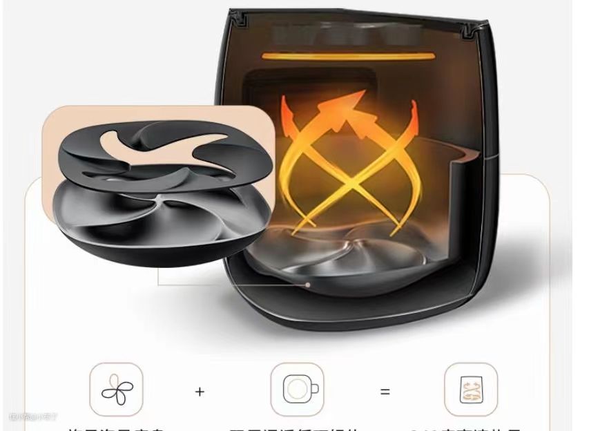 加热管提供热量,在通过风机将加热管的热量吹到锅里,在小空间内形成快速且高温的热风循环。