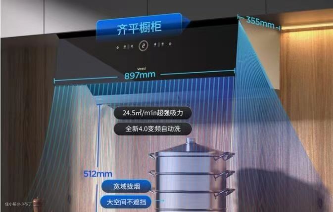 全新355mm灵活超薄设计,完美与橱柜齐平不碰头,视野开阔不当视线。24.5m³/min超强吸力,瞬吸油烟,开放式厨房同样能驾驭。