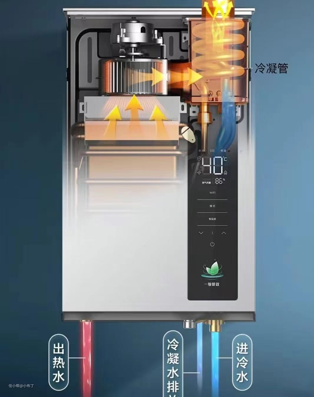 专利冷凝节能,省气省水省钱。增压瀑布浴,高扬程远水路。三巡航模式,满足不同用水需求。启动0波动,关水在开温度不便。APP智控,远程控制操作方便。四季随温感节能便捷。智能防冻,无氧铜水箱。