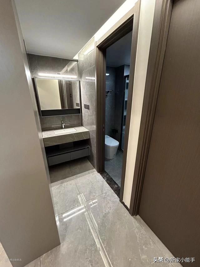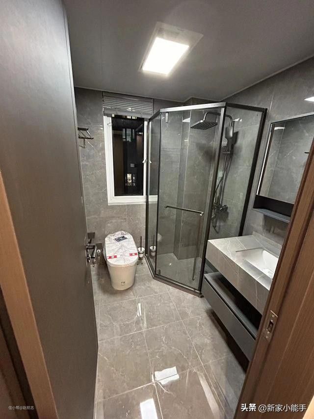 这是公共卫生间,使用会方便很多,考虑到需求,做了比较标准的干湿分离,洗澡的时候不会把整个空间给弄湿了,考虑非常周到,也非常值得推荐这样去做。选择到瓷砖也是一灰色调为主,好看并且耐脏,搭配起来也非常舒服!