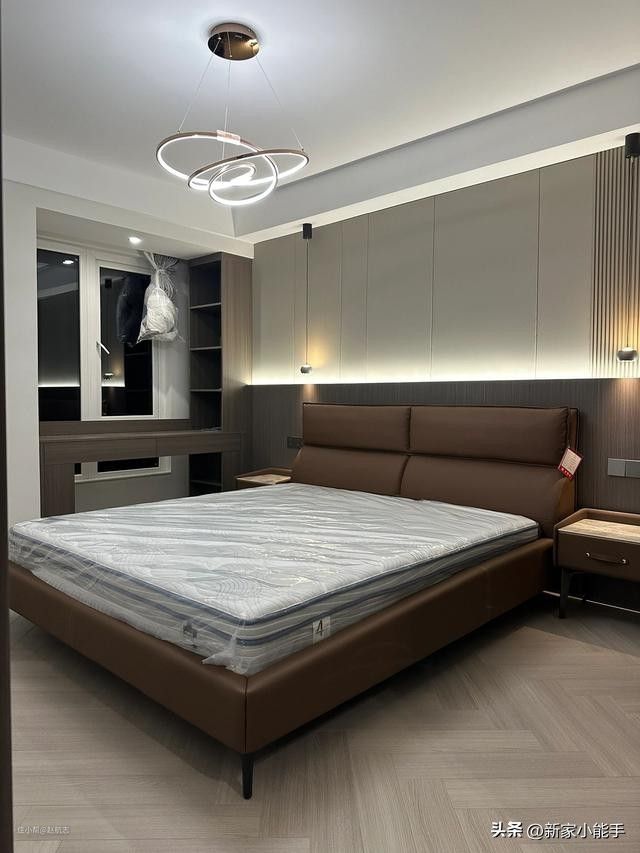 主卧一张双人大床已经布置进来了,大嫂位置刚好合适,同时,床头两边安装了小吊灯,晚上可以起到增加二次照明的作用,是嘴上还是比较大气的。