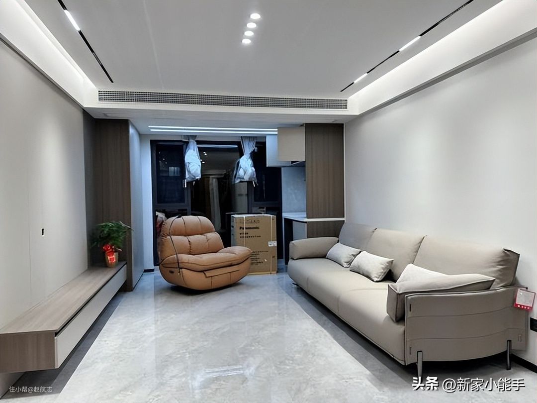 无主灯的设计如果也喜欢的话,真的可以参考一下。安装了中央空调,视觉上显得比较大气,同时使用也非常的方便。客厅跟阳台打通,利用断桥铝的方式进行封窗户,外面不管是下雨还是刮风的影响,作用非常大。而且阳台两边没有浪费空间,设计了柜子,可以增加一些储物空间,非常的实用。