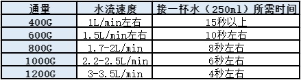 水流量越大,接水越快,如果不想久等就要买水流量大一些的净水器。我做了一个关于净水器通量和水流速度的相关性表格,大家看看自己能够忍受哪个通量的接水速度: