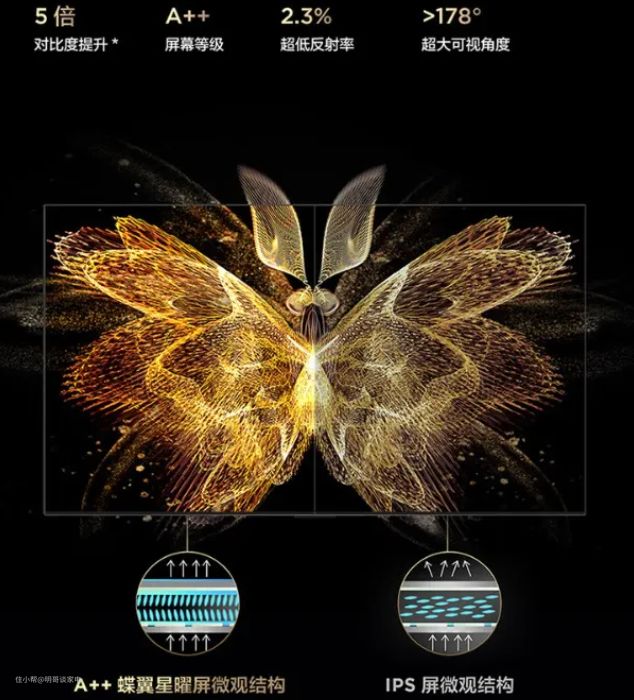 采用TCL华星A++蝶翼星耀屏,由于液晶分子倾角小,呈现一种蝶翼状的有序排列,使得背光光纤可以均匀通过,表面无反光,这种屏幕的优点就是大幅度提升原生对比度,降低屏幕反光,并且带来广角的可视角度