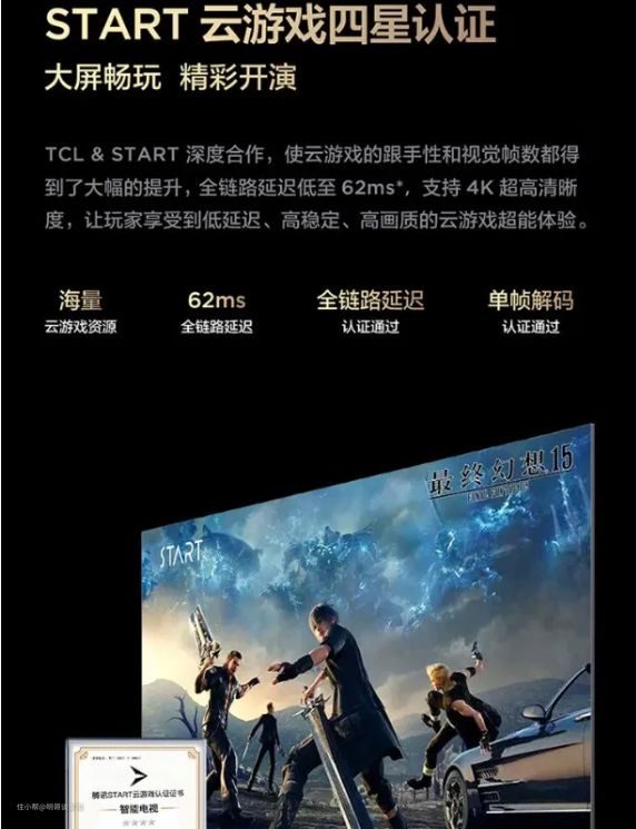 这里值得一提的是TH7增加了一个START云游戏四星认证,这是TCL与START深度合作推出的服务,使得云游戏的跟手性及视觉帧数都得到了大幅度的提升,全链路延迟低至62ms,让玩家能享受到低延迟,高稳定,高画质的云游戏超能体验,并且还有海量的云游戏资源哦