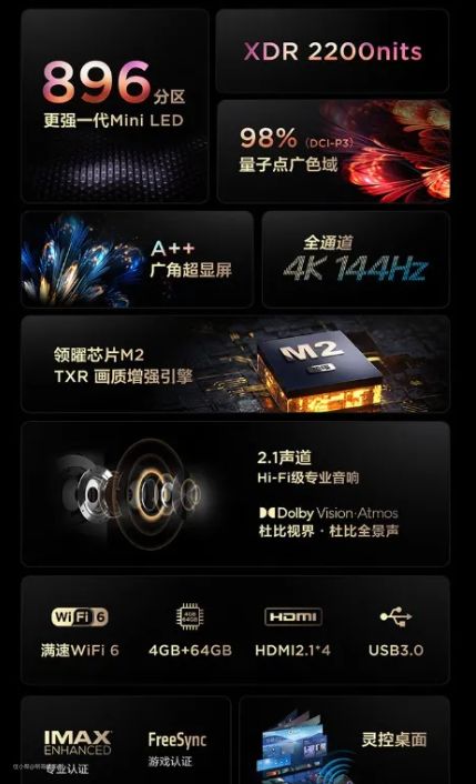 Q10H一共有3款尺寸65/75/85英寸,控光分区多达1080/1920/2304个,可以说画面呈现的细腻程度非常高且更具层次感,此外Q10H采用了微米级的Mini LED芯片,搭载DBR纳米复合均光膜和光学影像微透镜,带来了30°发光角度提升,30%散热性能提升以及31%亮度均匀性提升,精准实现了像素级点控光,画面的细节呈现愈发细腻,并且在新一代Mini LED的加持下,Q10H 的峰值亮度可以达到恐怖的3000nit,3000万:1的动态对比度,让画面亮部更耀眼夺目,暗部细节呈现也更为丰富,绝对是Mini LED画质之王