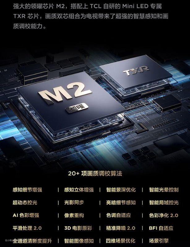 此外Q10H采用了领耀芯片M2 搭载TCL自研的Mini LED专属画质增强芯片 TXR ,可以实现20+项画质调教算法,深层次的优化画面的对比、色彩、清晰度等多个方面,使得画质的呈现更为逼真和细腻