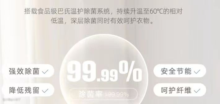 在高温除菌的基础上进行了改良,采用低温的原理进行杀菌,在不破坏衣物纤维的情况下对衣物杀菌,做到事半功倍的效果。巴氏除菌使用相对低温的60℃,进行物理深层杀菌除螨,实现99.99%的杀菌率、100%除螨率。