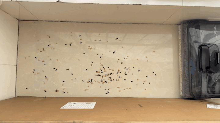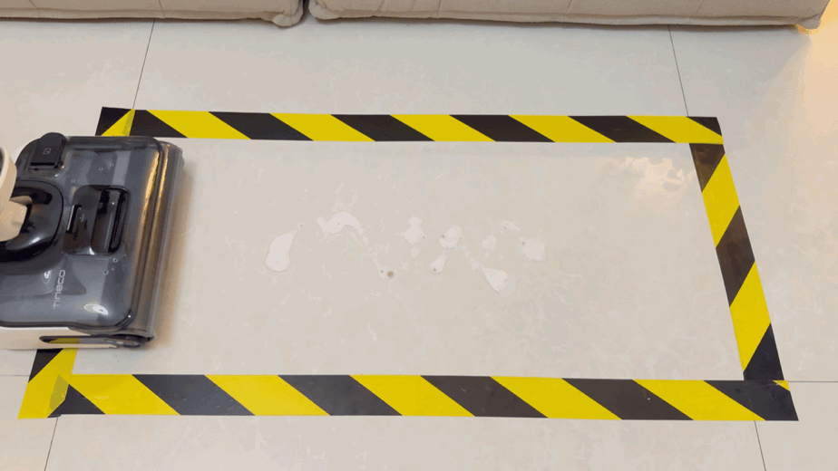 地面的番茄酱、蚝油、面条这种粘稠程度的污渍,一遍过去就基本0残留了。针对残渣剩饭等固体垃圾,洗地机也可以轻松清理。而且滚刷左、中、右部分的湿度都是一样的,拖过去的地面几乎没有水渍。