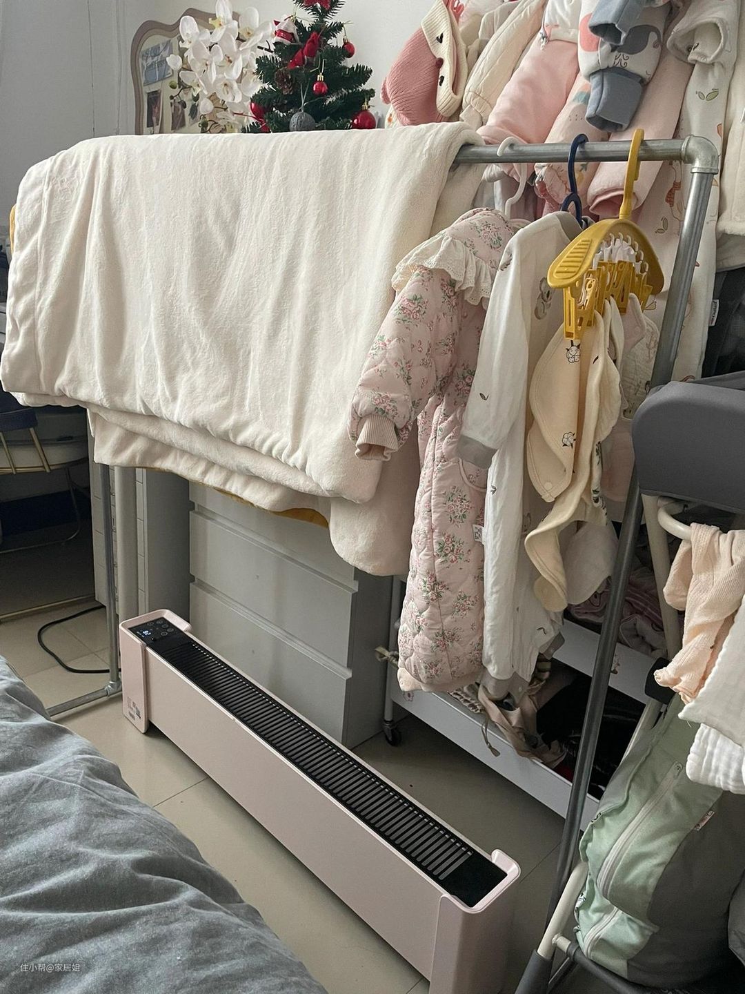 踢脚线取暖器也可以用来烘衣服,不过这种取暖器比较耗电,有朋友反馈一天开十来个小时电费要100元左右。
