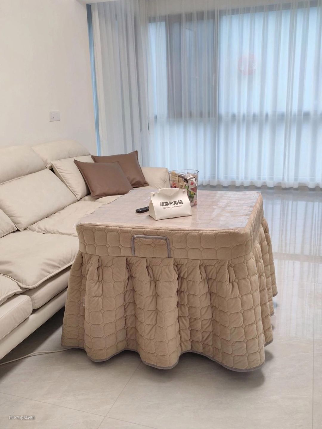 有点类似日式暖桌,比日式暖桌更实用,因为日式暖桌是落地式的,需要搭配地毯才好用,并且比较难搞卫生,不适合咱们的生活习惯。